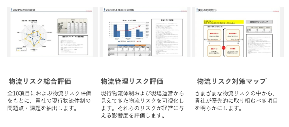 「物流リスク診断」では、貴社が保有する物流リスクをすべて洗い出し、具体的な対応策と、取り組むべき優先順位を明確にします。今後の方針検討の基礎情報として、ご活用ください。