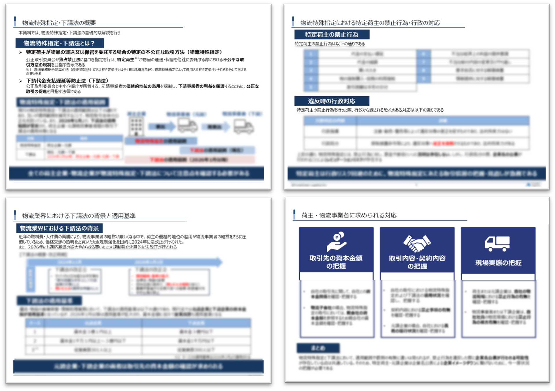 本資料では、法規制の基本構造と適用範囲の変遷、荷主・元請が絶対遵守すべき禁止行為、そして2026年改正を見据えた「価格交渉適正化」のための実務的な対応ステップを解説します。