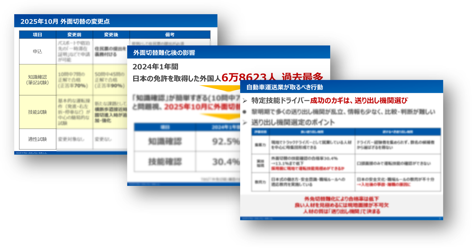 本資料では、外免切替の具体的な【変更点】と、合格率低下がもたらす【影響】をデータをもとに解説。さらに、この難局を乗り越える【対策】として、採用の成否を決定づける「送り出し機関の選定ポイント(集客力・実技環境・教育力)」を徹底解説します。