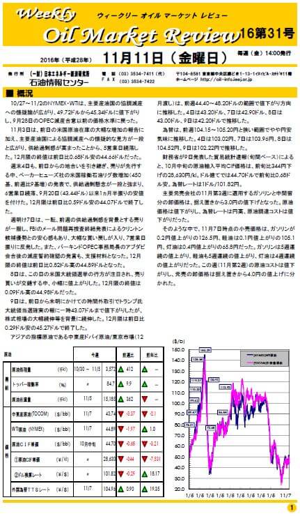 10/27~11/2のNYMEX・WTIは、主要産油国の協調減産への懐疑論が広がり、49.72ドルから45.34ドルに値下がりし、9月28日のOPEC減産合意以前の価格水準に戻った。