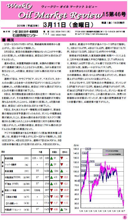 2/25~3/2のNYMEX・WTIは、需給緩和解消期待から値上がりし、32~34ドルで推移した。