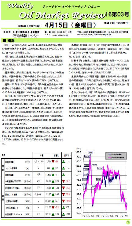 3/31~4/6のNYMEX・WTIは、4ヵ国による原油市況対策の会合の行方が不透明になったとの見方などからさらに下落し、35~38ドルで推移した。