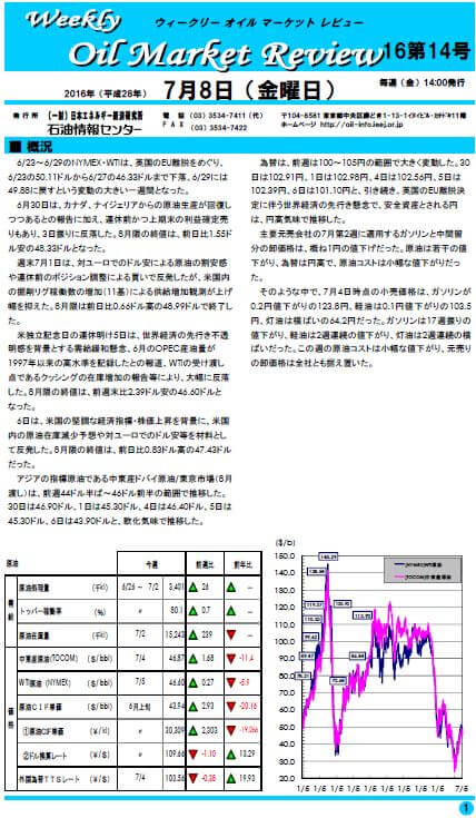 6/23~6/29のNYMEX・WTIは、英国のEU離脱をめぐり、6/23の50.11ドルから6/27の46.33ドルまで下落、6/29には49.88に戻すという変動の大きい一週間となった。