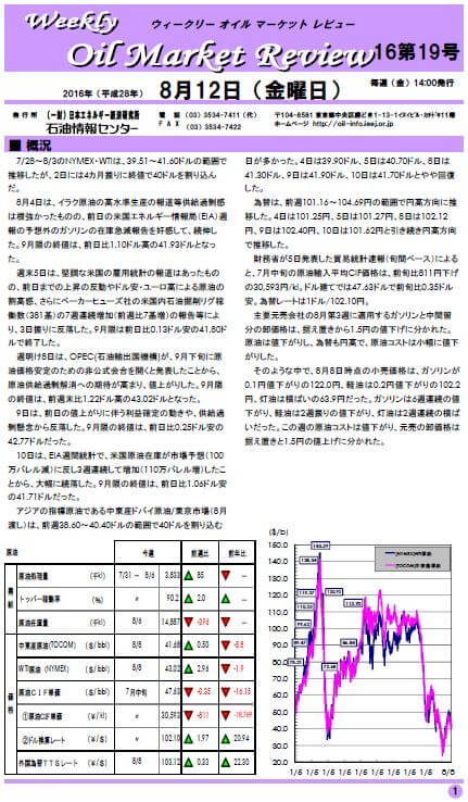 7/28~8/3のNYMEX・WTIは、39.51~41.60ドルの範囲で推移したが、2日には4カ月振りに終値で40ドルを割り込んだ。