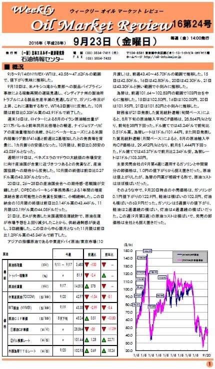 9月15日は、米メキシコ湾から東部への製品パイプライン事故による稼働再開の遅延見通し、インディアナ州の製油所トラブルによる製品生産半減の見通しなどで、ガソリン市況が上昇、これに連動する形で、WTIも3日振りに反発した。10月限は前日比0.33ドル高の43.91ドルで終了した。…