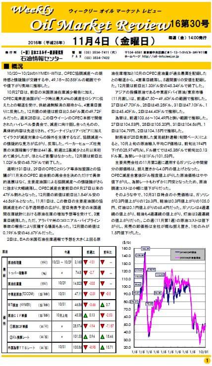 10/20~10/26のNYMEX・WTIは、OPEC協調減産への期待感と懐疑論が交錯する中、49.18~50.85ドルの範囲でやや値下がり気味に推移した。