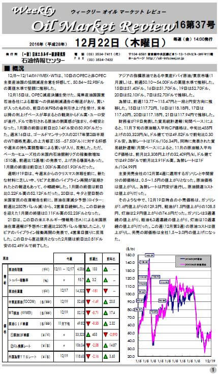 12/8~12/14のNYMEX・WTIは、10日のOPECと非OPEC主要産油国の協調減産合意を好感して、50.84~52.98ドルの高値水準で堅調に推移した。