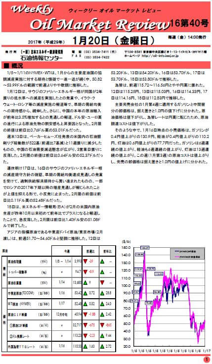 1/5~1/11のNYMEX・WTIは、1月からの主要産油国の協調減産実施に対する期待と懐疑で一進一退が続く中、50.82~53.99ドルの範囲で前週よりやや軟調に推移した。