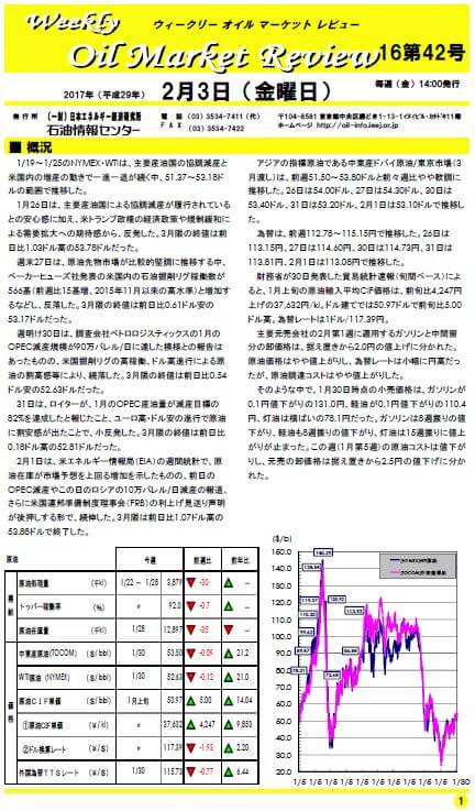 1/19~1/25のNYMEX・WTIは、主要産油国の協調減産と米国内の増産の動きで一進一退が続く中、51.37~53.18ドルの範囲で推移した。