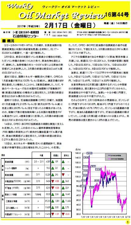 2/2~2/8のNYMEX・WTIは、引き続き、主要産油国の協調減産実施と米国の供給増加見通しを材料に、52.17~53.83ドルの範囲で、一進一退で推移した。