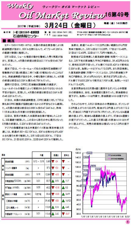 3/9~15のNYMEX・WTIは、米国の原油在庫急増により供給過剰感が強まり、50ドルを割り込んで、47.72~49.28ドルの範囲で軟調に推移した。