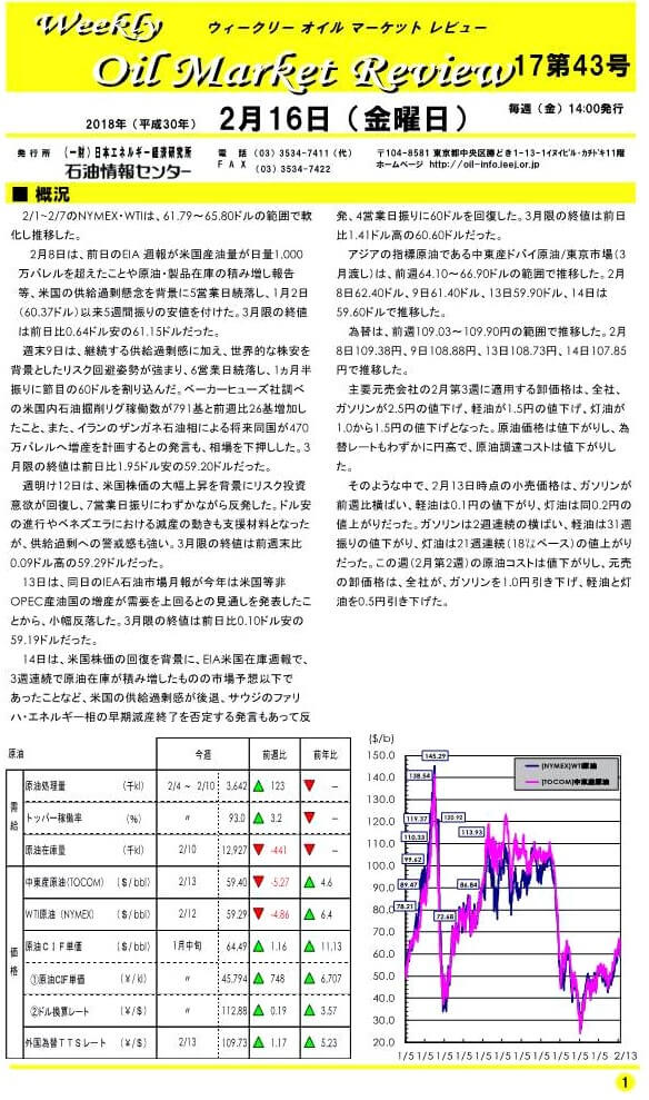 2/1~2/7のNYMEX・WTIは、61.79~65.80ドルの範囲で軟化し推移した。