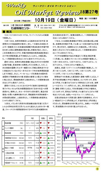 10月11日は、世界同時株安による経済先行き不安・投資家リスク回避姿勢が高まり、また、一日遅れの米国エネルギー情報局(EIA)の米国在庫週報で原油在庫の市場予想を大きく上回る3週間連続の積み増しの報告があり、さらに、この日発表されたOPEC月報が新興国の経済減速を理由に2019年の需要見通しを下方修正したことから、大幅反落した。11月限終値は前日比2.20ドル安の70.97ドルだった。…