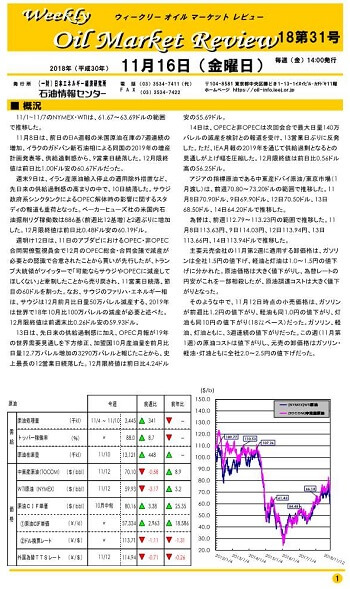 11月8日は、前日のEIA週報の米国原油在庫の7週連続の増加、イラクのガドバン新石油相による同国の2019年の増産計画発表等、供給過剰感から、9営業日続落した。12月限終値は前日比1.00ドル安の60.67ドルだった。…