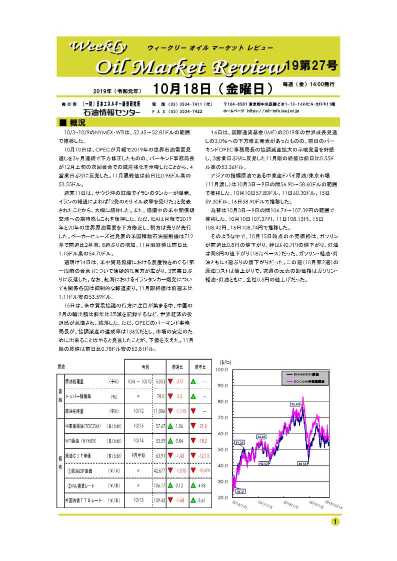 10/3~10/9のNYMEX・WTIは、52.45~52.81ドルの範囲で推移した。