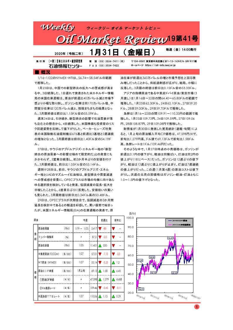 1月23日は、中国での新型肺炎の拡大への警戒感が高まる中、3日続落した。1日遅れで発表された米エネルギー情報局の米国在庫週報は、原油が前週比40万バレル減と市場予想より小幅な取り崩し、ガソリン在庫は同170万バレル増、中間留分在庫は120万バレル減と、強弱まちまちの結果となった。3月限終値は前日比1.15ドル安の55.59ドル。…