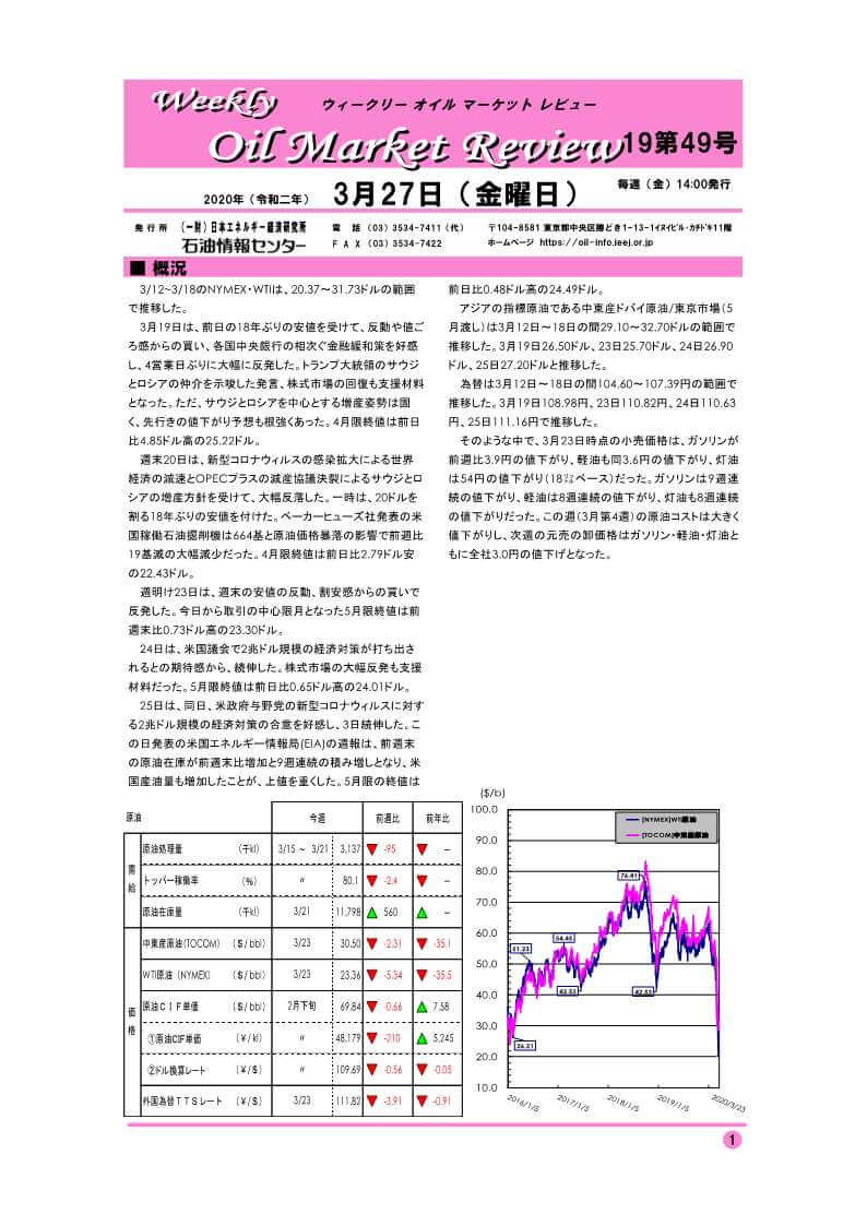 3月19日は、前日の18年ぶりの安値を受けて、反動や値ごろ感からの買い、各国中央銀行の相次ぐ金融緩和策を好感し、4営業日ぶりに大幅に反発した。トランプ大統領のサウジとロシアの仲介を示唆した発言、株式市場の回復も支援材料となった。ただ、サウジとロシアを中心とする増産姿勢は固く、先行きの値下がり予想も根強くあった。4月限終値は前日比4.85ドル高の25.22ドル。…