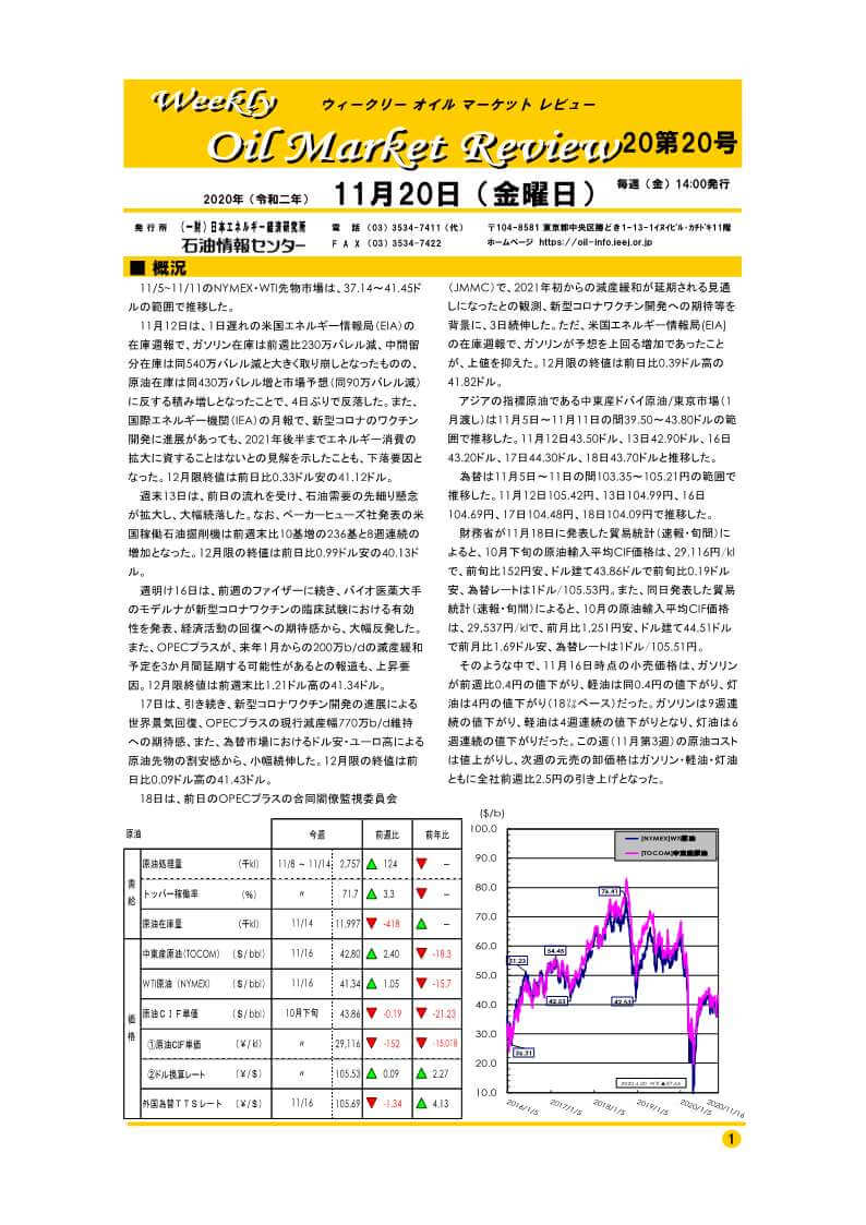 11月12日は、1日遅れの米国エネルギー情報局(EIA)の在庫週報で、ガソリン在庫は前週比230万バレル減、中間留分在庫は同540万バレル減と大きく取り崩しとなったものの、原油在庫は同430万バレル増と市場予想(同90万バレル減)に反する積み増しとなったことで、4日ぶりで反落した。また、国際エネルギー機関(IEA)の月報で、新型コロナのワクチン開発に進展があっても、2021年後半までエネルギー消費の拡大に資することはないとの見解を示したことも、下落要因となった。12月限終値は前日比0.33ドル安の41.12ドル。…