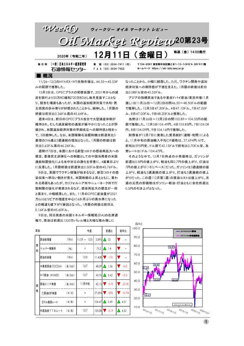 石油に関する情報を様々な形で提供している「一般財団法人日本エネルギー研究所石油情報センター」による、最新石油市場動向に関するプレスリリースです。