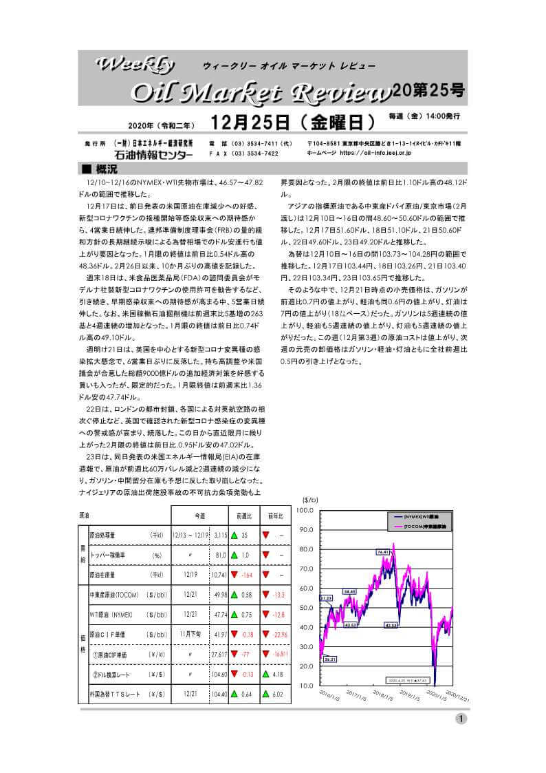 12月17日は、前日発表の米国原油在庫減少への好感、新型コロナワクチンの接種開始等感染収束への期待感から、4営業日続伸した。連邦準備制度理事会(FRB)の量的緩和方針の長期継続示唆による為替相場でのドル安進行も値上がり要因となった。1月限の終値は前日比0.54ドル高の48.36ドル。…