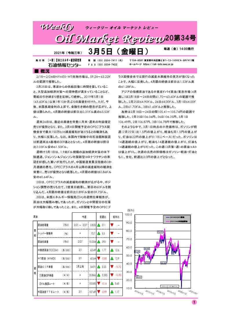 2月25日は、寒波からの供給回復に時間を要していること、大型追加経済対策への期待感が高まっていることなど、需給の引き締まり感を反映して続伸し、2019年5月1日(63.60ドル)以来1年10か月ぶりの高値を付けた。ただ、午後、米国長期金利の上昇で、金融引き締め懸念が広がり、上値は限られた。4月限の終値は前日比0.31ドル高の63.53ドル。…