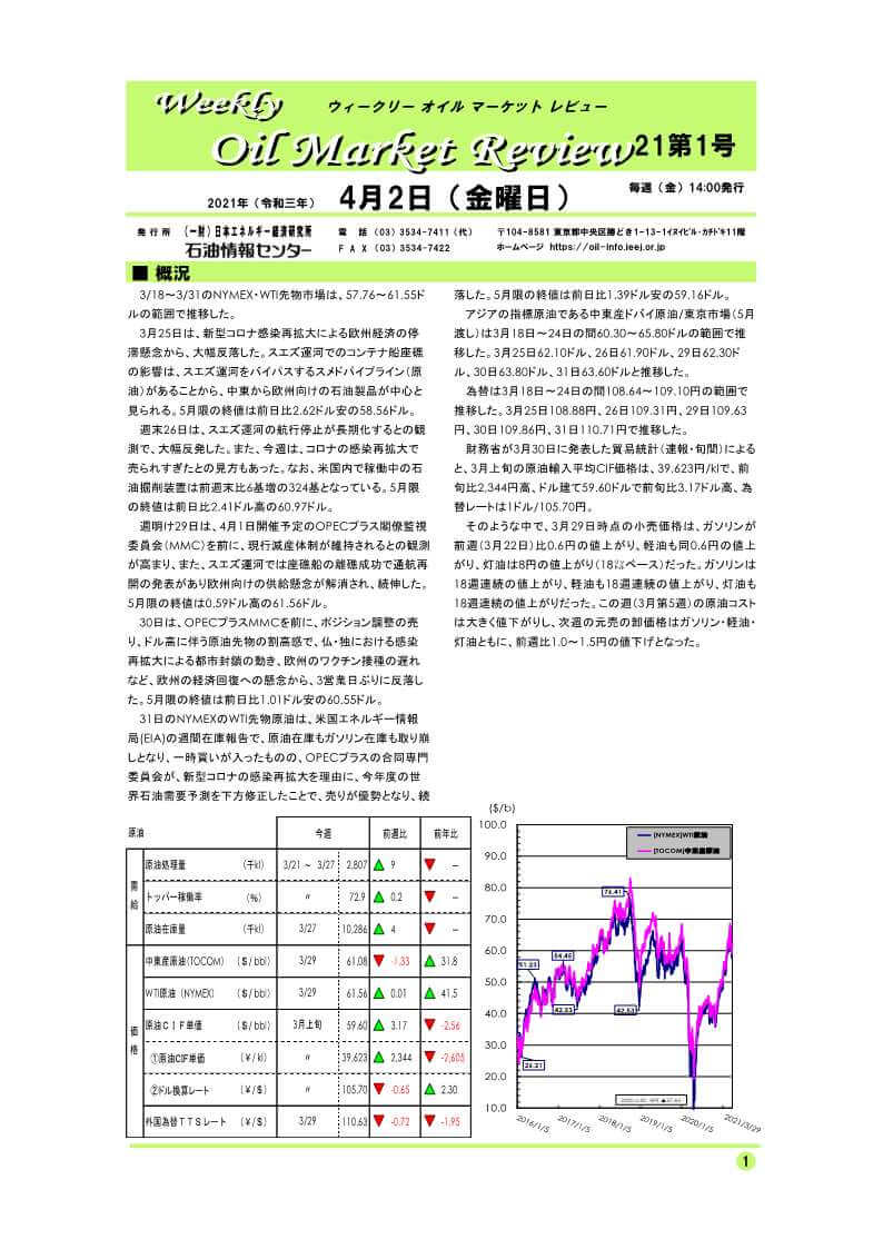 3月25日は、新型コロナ感染再拡大による欧州経済の停滞懸念から、大幅反落した。スエズ運河でのコンテナ船座礁の影響は、スエズ運河をバイパスするスメドパイプライン(原油)があることから、中東から欧州向けの石油製品が中心と見られる。5月限の終値は前日比2.62ドル安の58.56ドル。…