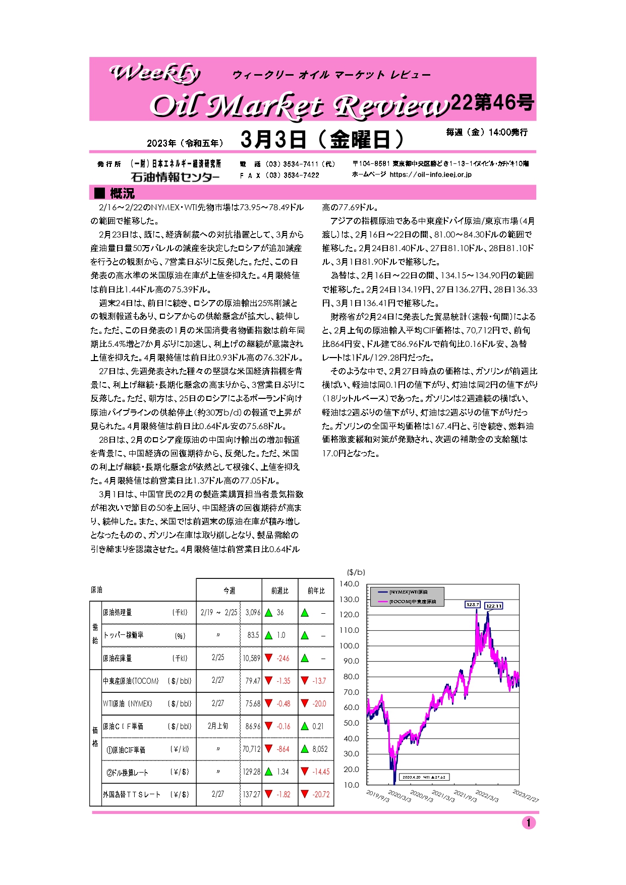 石油に関する情報を様々な形で提供している「一般財団法人日本エネルギー研究所石油情報センター」による、最新石油市場動向に関するプレスリリースです。