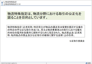 第1講座「物流業界の最新動向 ~物流特殊指定・特定荷主を詳しく解説~」では、特定荷主の禁止行為や独占禁止法違反行為への対処について解説しました。