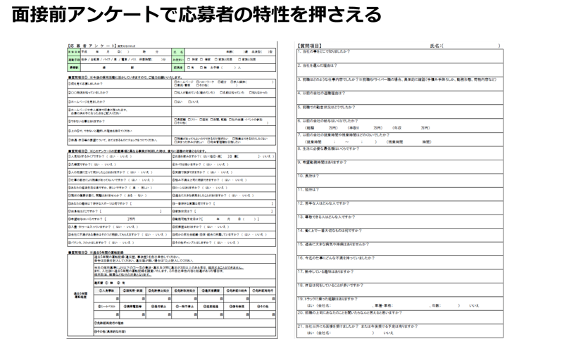項目には、何を見て応募したか、できない仕事はあるか、休日の要望など応募者の本当の特性がわかる項目を盛り込みます。