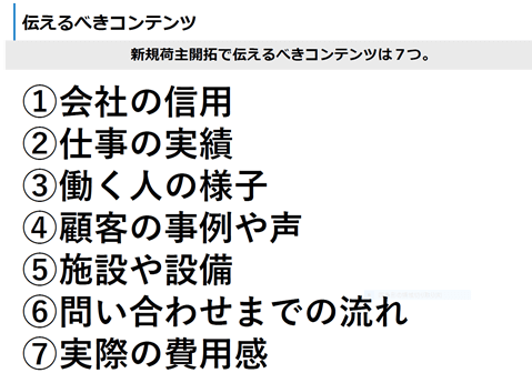 中小企業がウェブサイトを立ち上げる際のポイントとして、「ターゲットをよく知る」、「自社のことをよく知る」、「マーケットをおさえる」ということが非常に重要です。さらに新規荷主開拓には右記①~⑦のコンテンツを取り入れ、相手が求めるもの、かつ競合よりも自社が勝っている強みを分かりやすく打ち出すことで、顧客目線のウェブサイトを作ることができます。