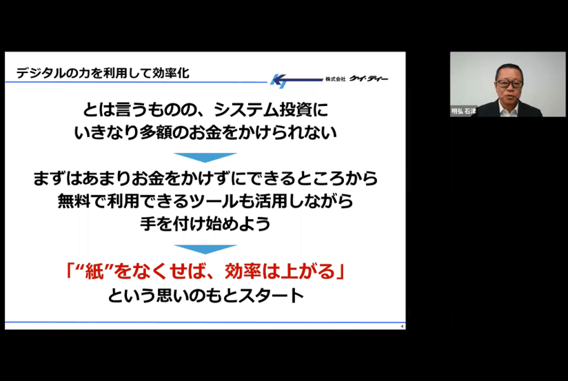 ケイ・ティー様では、いきなり多額のシステム投資から始めるのではなく、「紙をなくせば、効率が上がる」という考えのもと、まずは、あまり費用をかけずにできるところからデジタル化導入に着手しました。