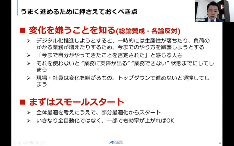 デジタル化を進めるためには、それを使わないと業務に支障が出る、というぐらい徹底すること、業務全体、目的を把握したうえで業務の一部を効率化することを意識して進めることが重要です。
