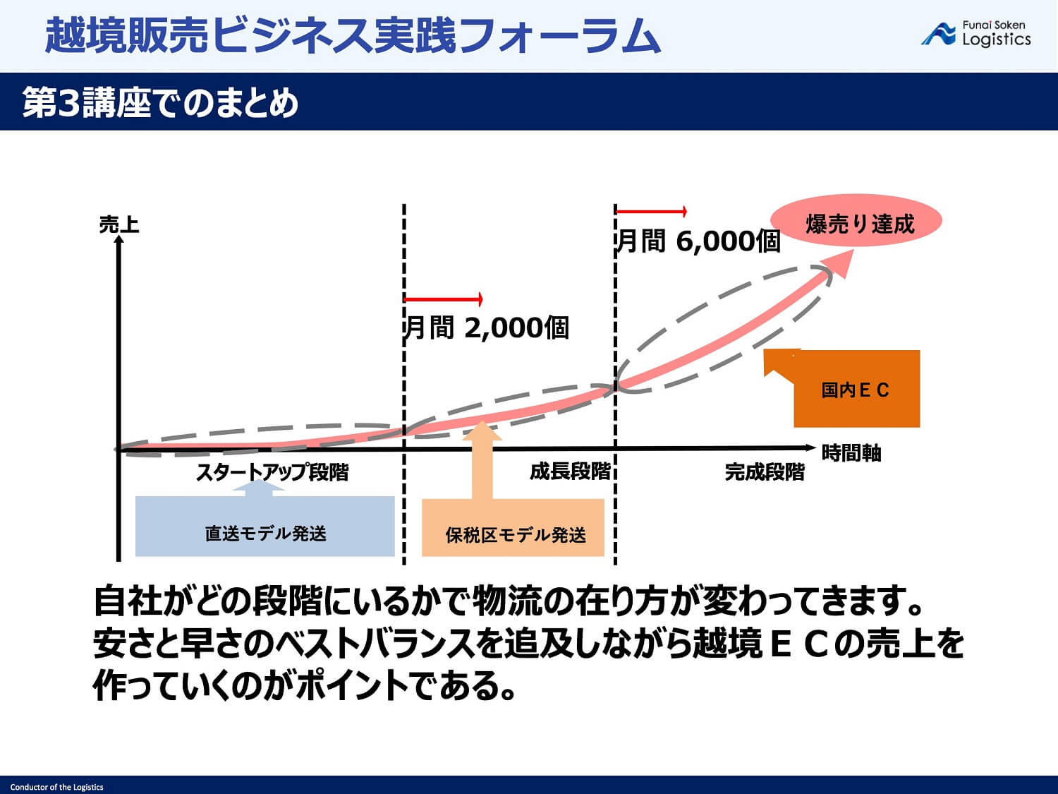 ベストバランスを追求しながら、直送モデル⇒保税区モデル⇒国内ECモデルと物流の仕組を進化させていくことがポイントです。
