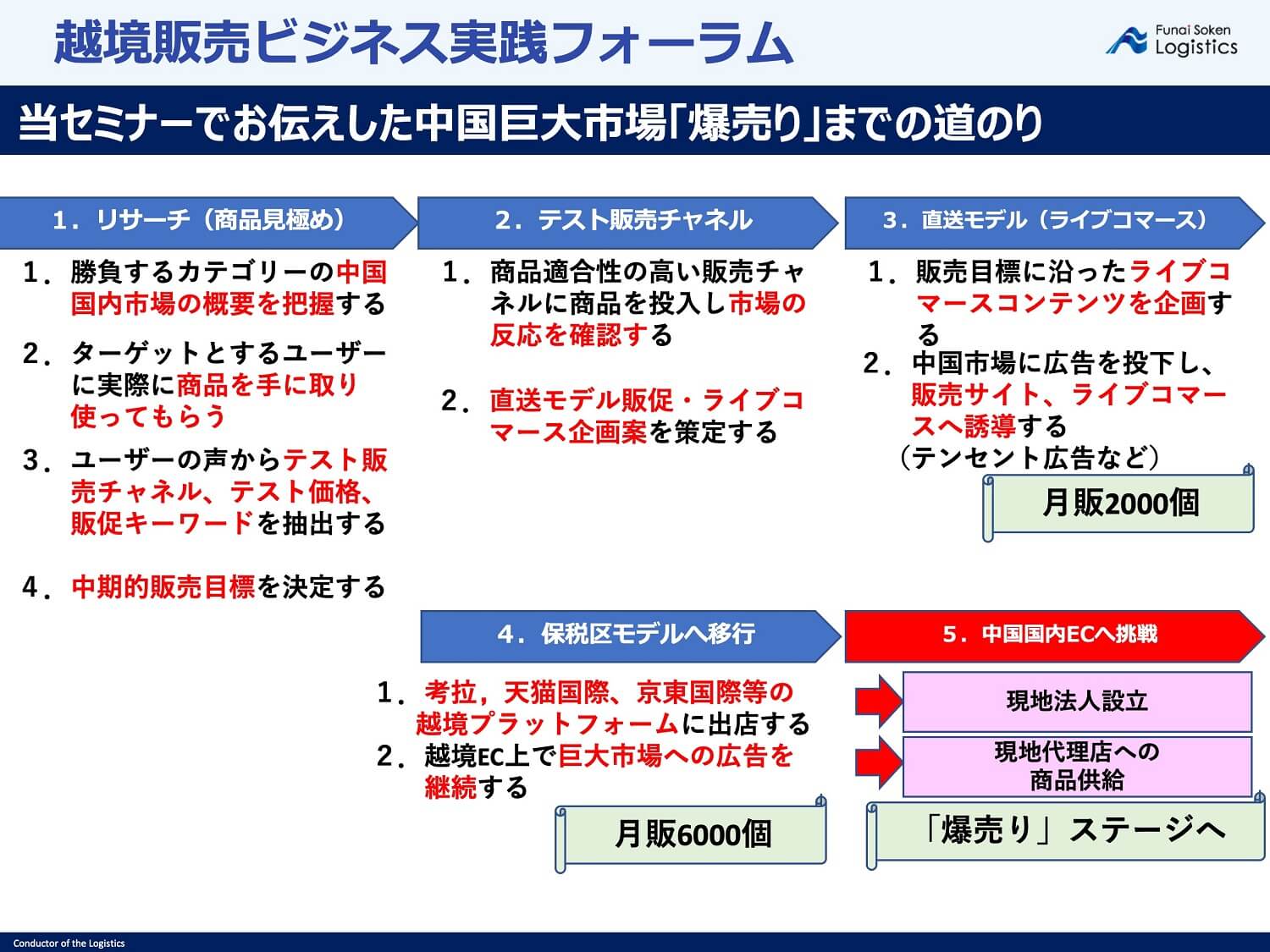 最後に、月販6,000個を越えたら、いよいよ中国国内ECへ挑戦しましょう。現地法人設立や現地代理店への商品提供を視野に入れます。