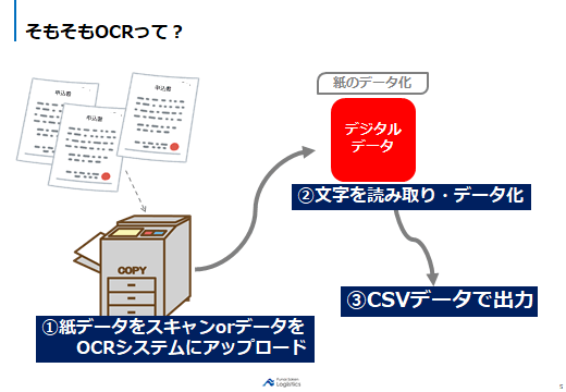 - 「爆読みLOGI-OCR with AI inside」は、手書き書類や帳票の文字読取を行って、データ化する物流会社のための、AI技術*を使ったOCRサービスです。大量の書類のデータ化によって帳票処理業務にかかわる人件費・入力ミス・保管スペース等の削減ができます。また過去データの管理・検索を手軽に実施でき、業務効率も向上します。
