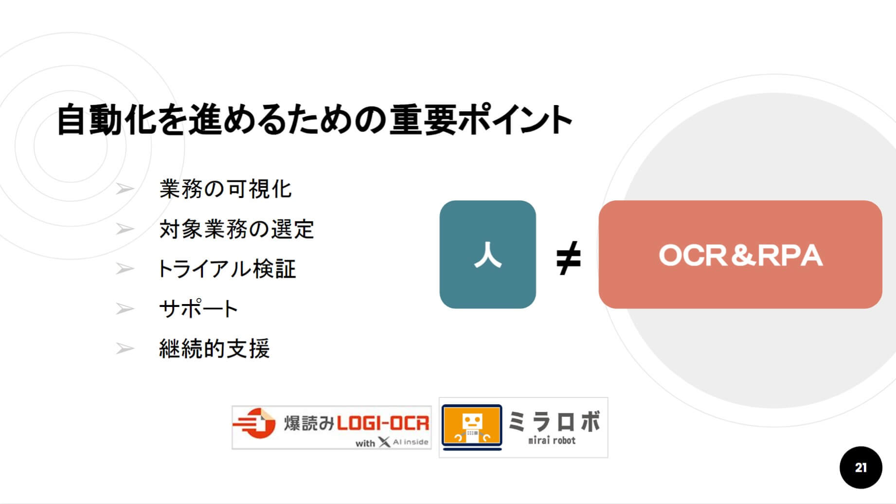 本セミナーでは、「生産性向上」「業務効率化」のツールとして注目を集めているAI-OCRとRPAの導入・活用方法を、大きな成果のあがった実例も交えながらお伝えしました。