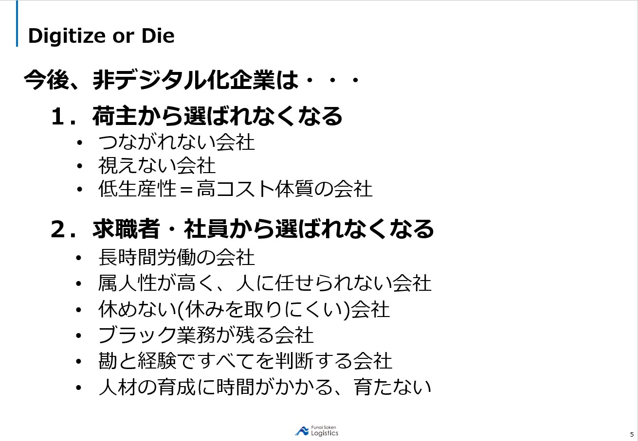 物流会社のデジタル化が進んでいく中で、非デジタル化企業は荷主・社員から選ばれれなくなります。