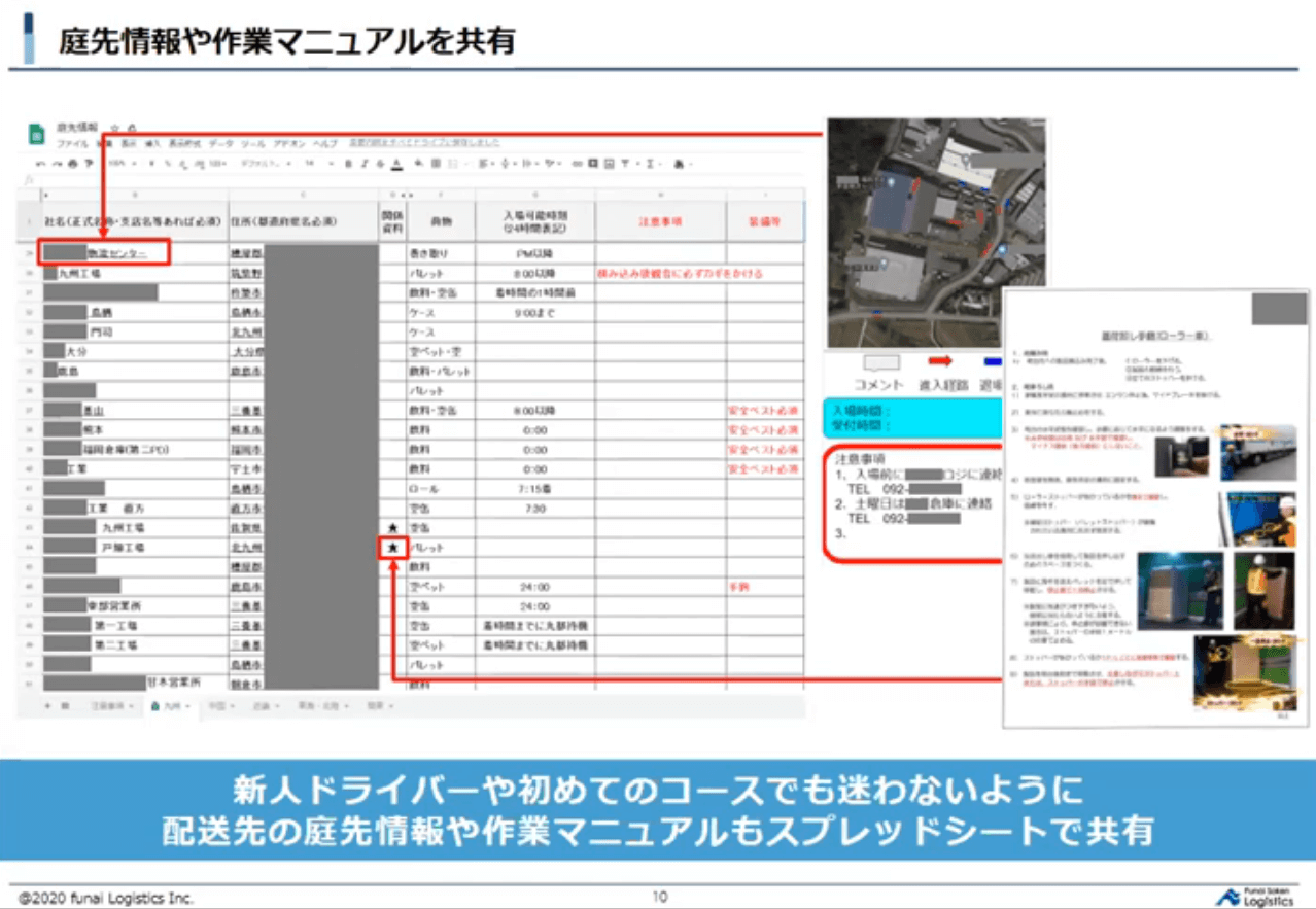 新人ドライバーや初めてのコースでも迷わないように配送先の庭先情報や作業マニュアルもスプレッドシート共有出来ます。