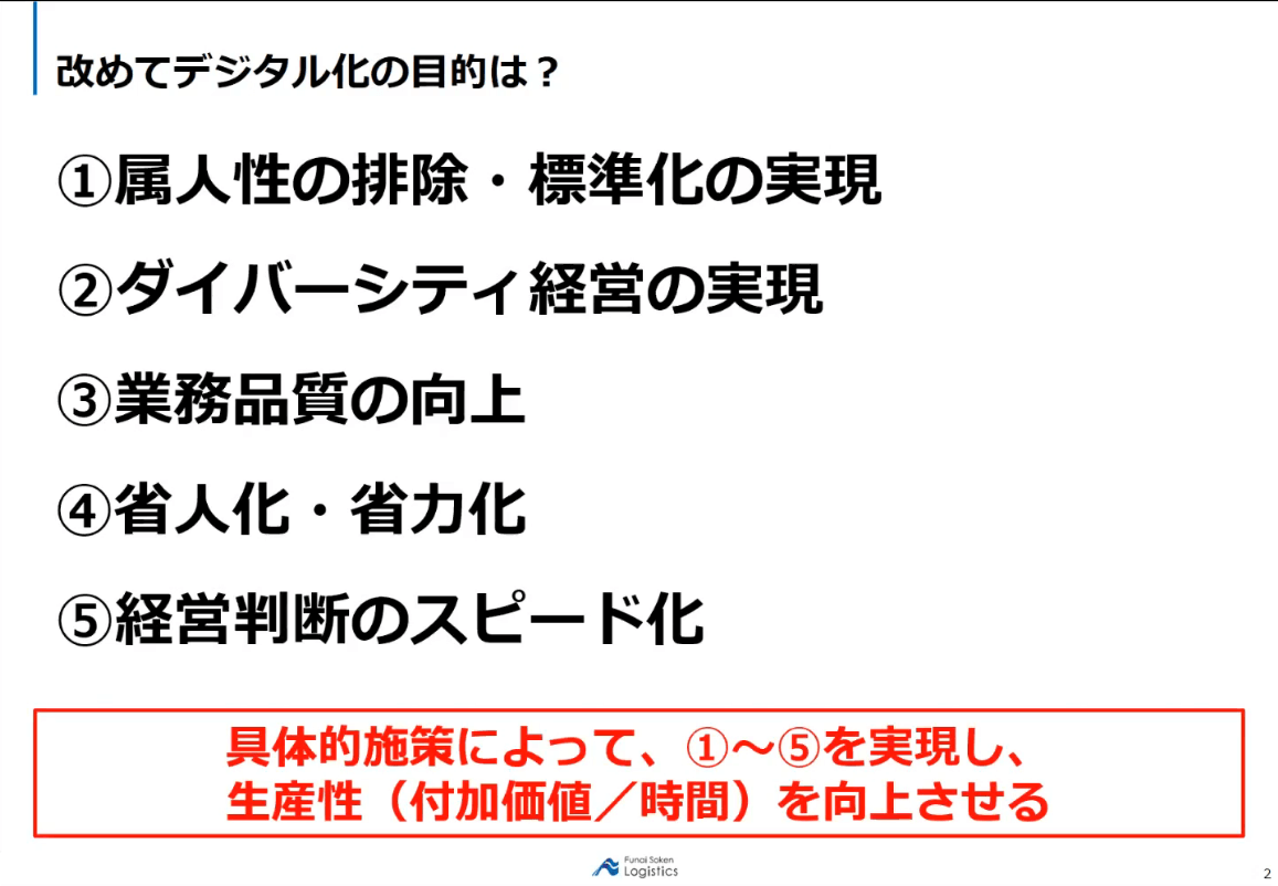 昨今、物流業界においても”働き方改革”・”高生産性の実現”・”時流適応の経営”などが求められており、「デジタル化」に着目している企業も多いかと思います。本セミナーでは、東運輸株式会社 代表取締役 飯田 武徳 氏をお招きし、中小物流会社がデジタル化を進めるために重要なポイントについて、実際の事例を交えてお伝えしました。