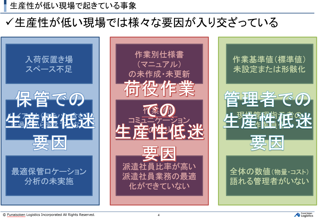 物流現場の生産性が低い要因を分析し、保管効率を向上できない理由について解説し、生産性の向上に必要な課題問題点の抽出方法について詳しく説明しました。