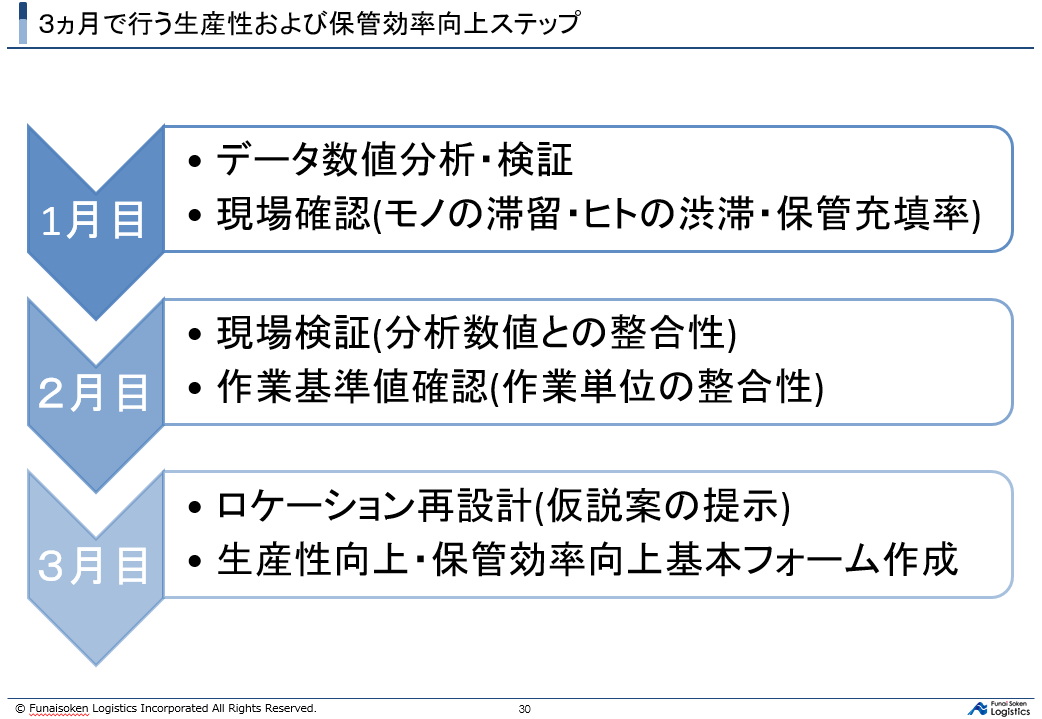 理解しやすいサンプルにより、継続的に行う数値検証の仕方を紹介し、生産性および保管効率向上の各ステップにやるべき項目を詳しく説明しました。
