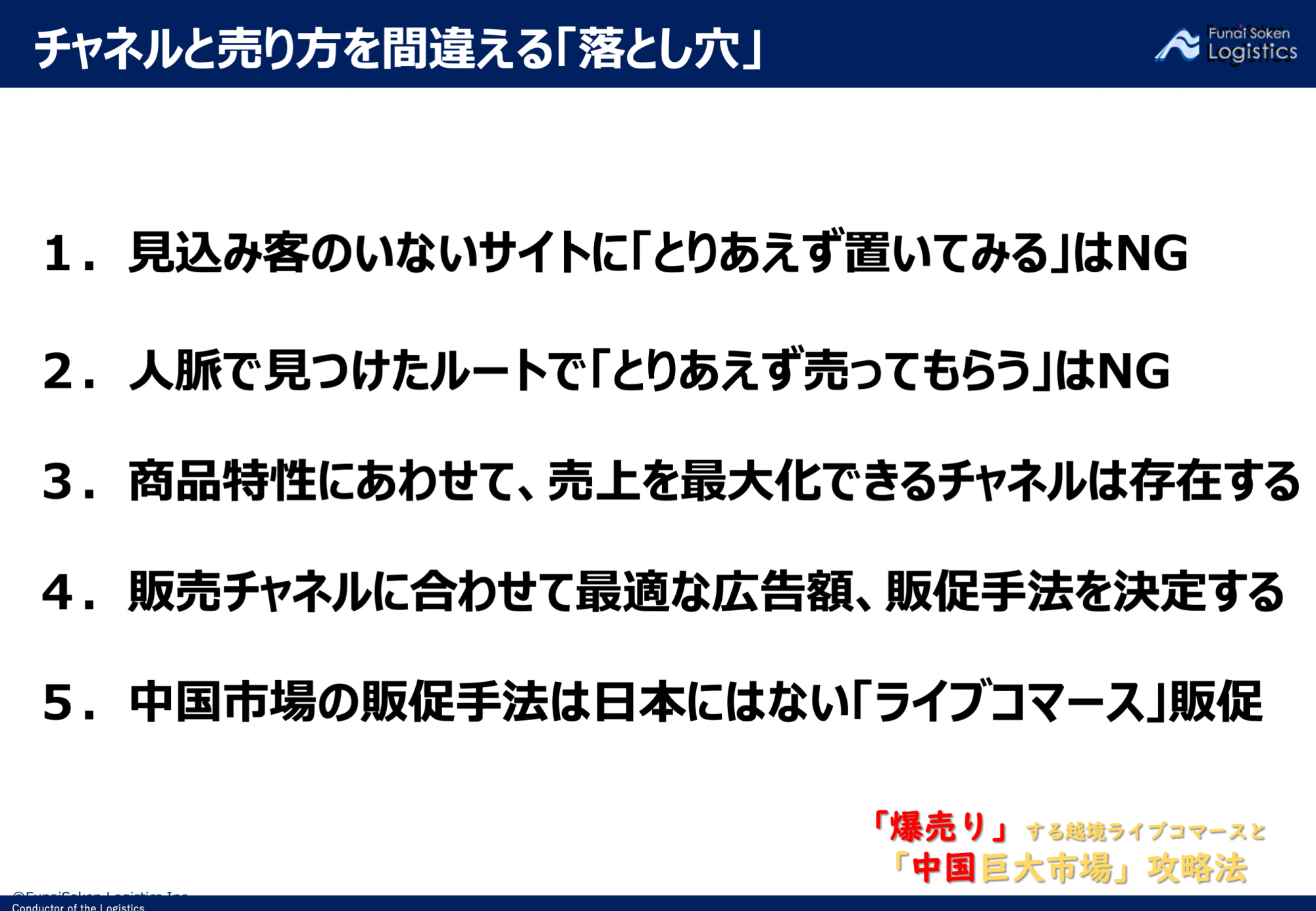 越境ECは人脈がすべてではありませんので、チャネル、売り方、マーケティング戦略を適切に選ぶ必要があります。