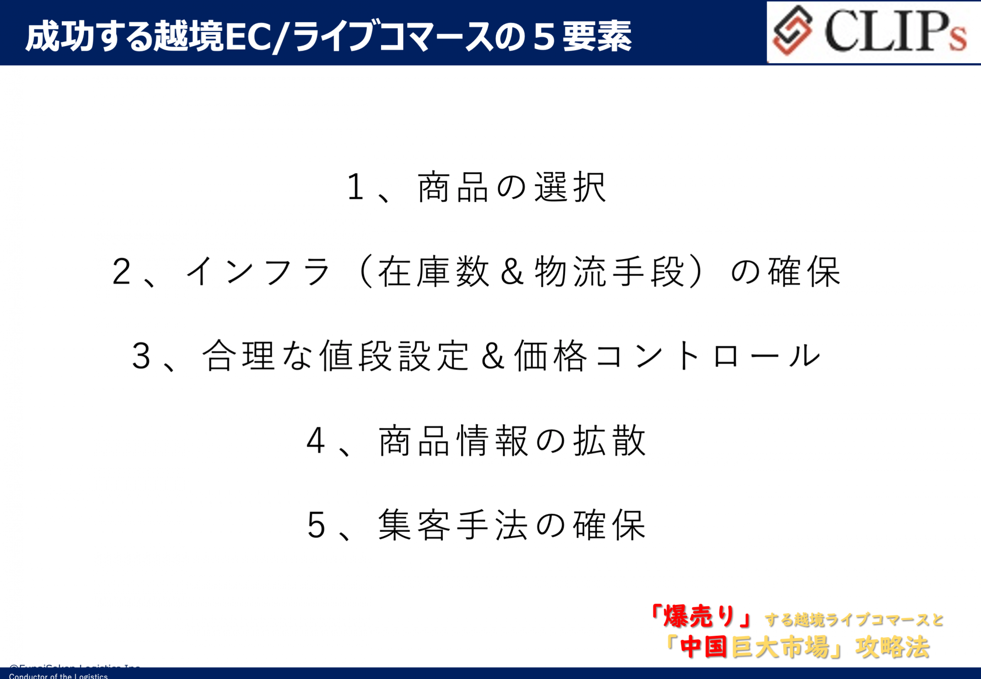 クリップス社が中国大手旅行代理店の優良顧客に対して1番組だけで数億円の売上を作った成功経験を成功するライブコマースの5要素としてまとめていただきました。