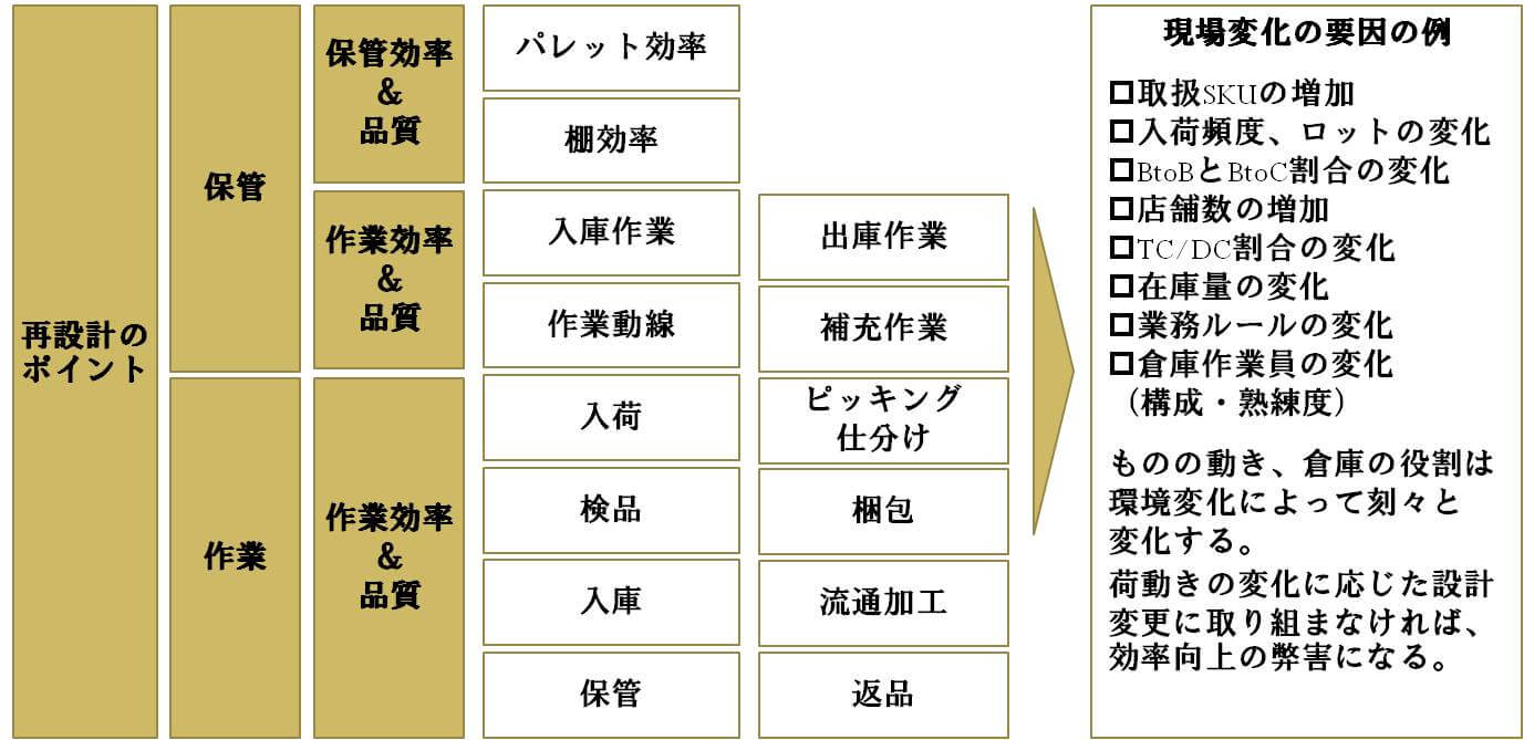 効率を見極め、改良を加える際には業務の再設計が必要になります。例えば、倉庫の再設計には現場変化・環境変化を掴むことが重要になります。