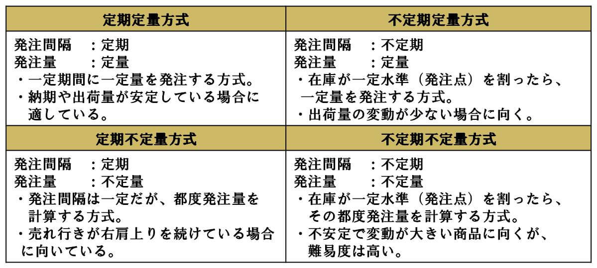 在庫コントロールを行う上では、発注タイミングと発注数量を決める必要があります。発注タイミングは定期的に行う場合と不定期に行う場合、発注数量は毎回同じ数量を発注するパターンと発注時点で数量を決定するパターンがあります。