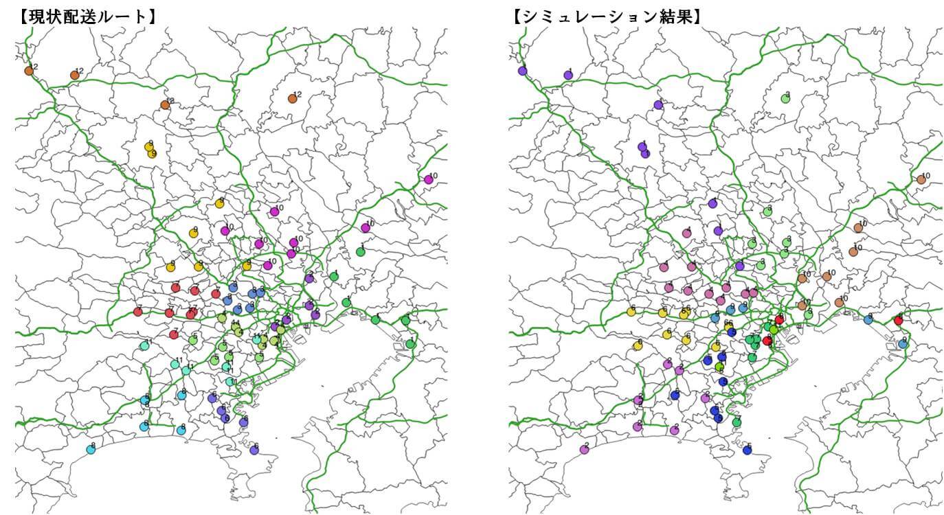 さらに、現状の配送ルートと最適ルートのシミュレーション結果を比較することも可能です。