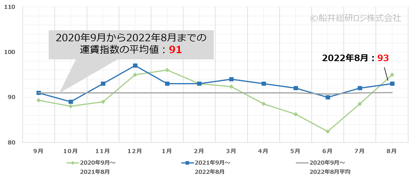 ・2022年8月のトラック運賃指数は、前月比+1、前年同月比は-2の93であった