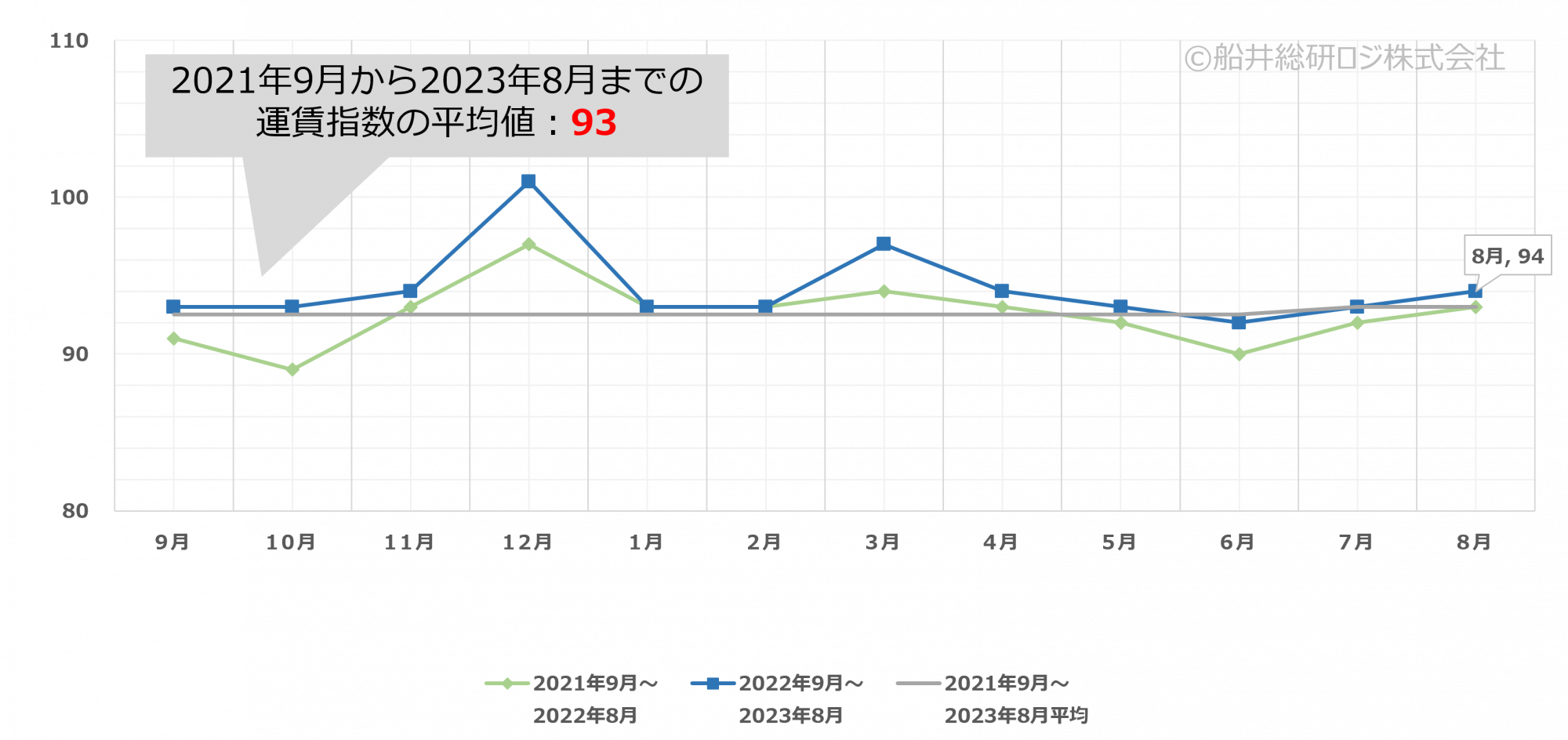 ・2023年8月のトラック運賃指数は、前月比+1、前年同月比+1の93となっている