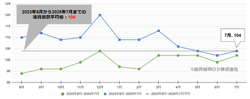 - 2025年7月のトラック運賃指数は、前月比+2、前年同月比+2の104となっている