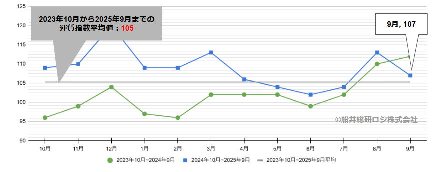 - 2025年9月のトラック運賃指数は、前月比-6、前年同月比-5の107となっている